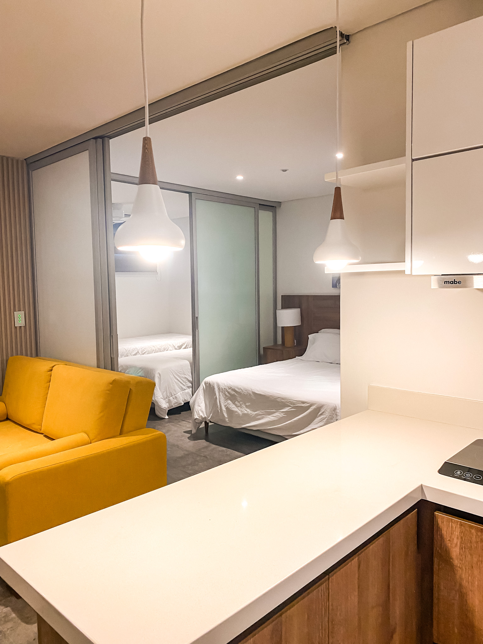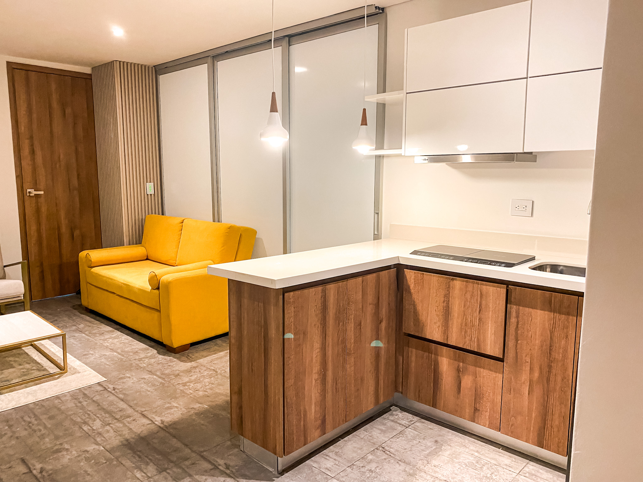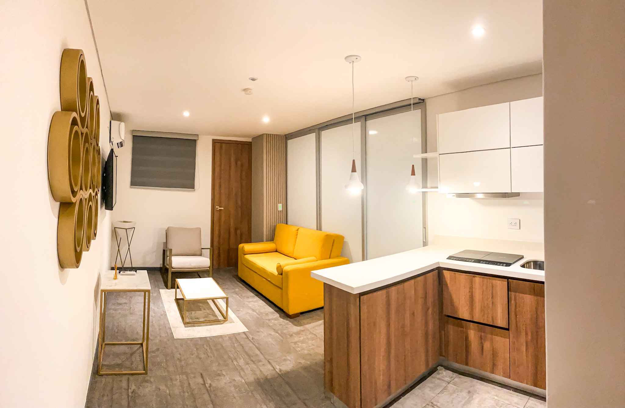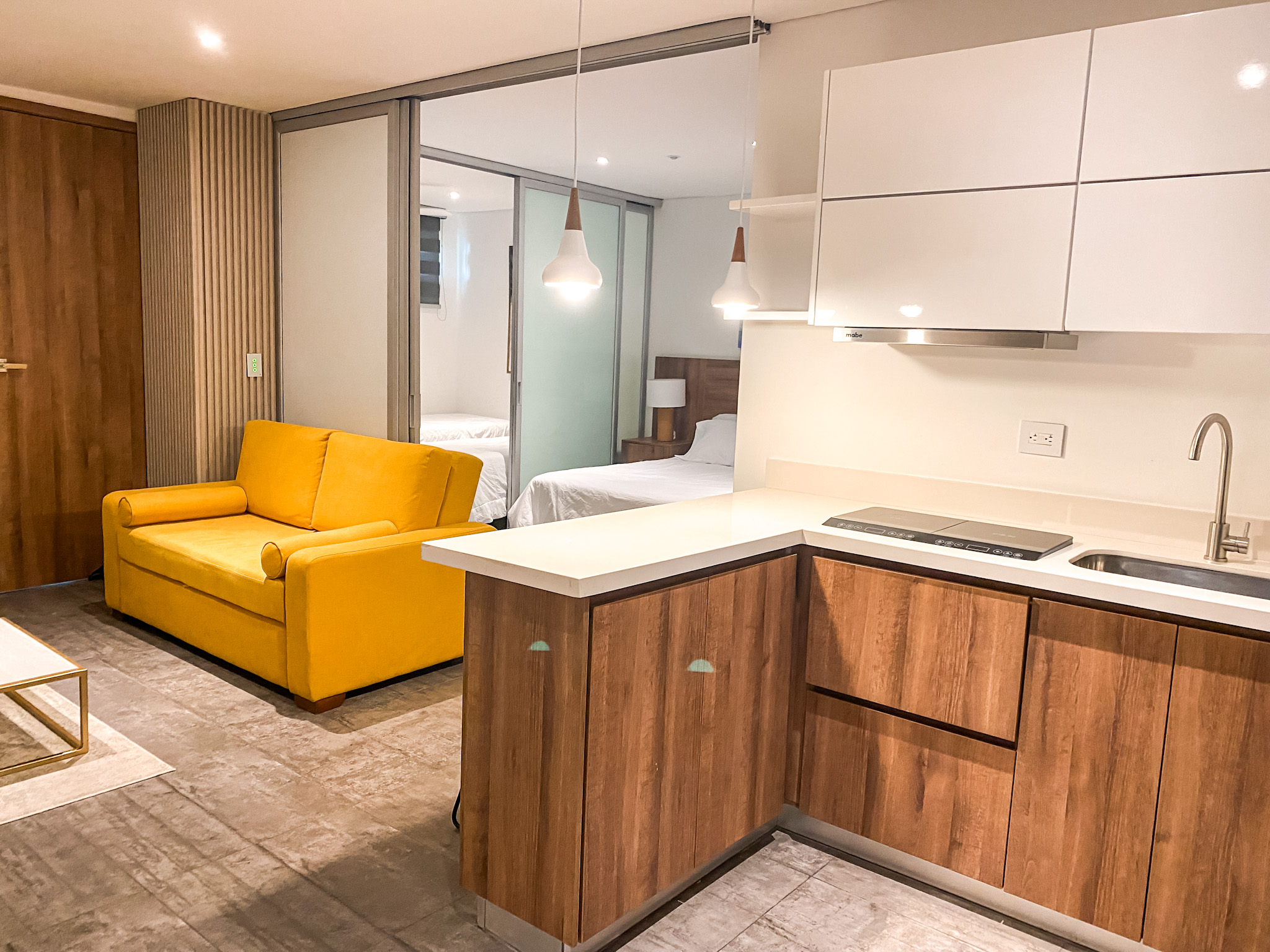• Servicios Cama queen para dos personas, Closet con ganchos para ropa., Ducha con calentador, Escritorio de trabajo, Jabón para cuerpo, Mesa de centro y mesa auxiliar, Nevera, cafetera, utensilios como sartenes, ollas, cubiertos, platos, vasos y copas., Poltrona, Smart TV, Sofá cama, Toallas para cuerpo, manos y pies