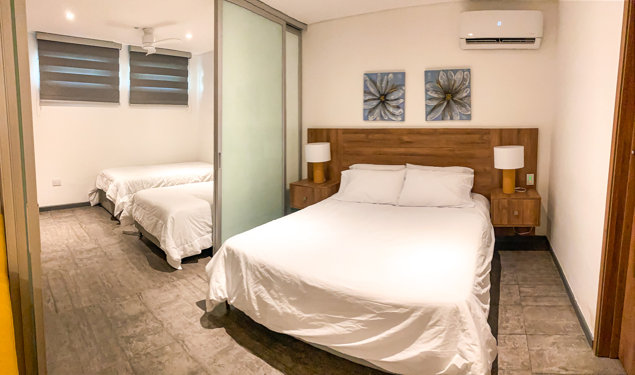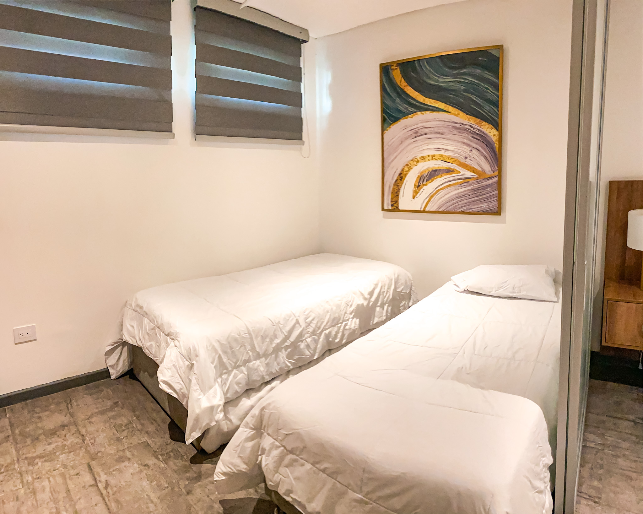 • Servicios Closet con ganchos para ropa., Dos camas de un cuerpo c/u, Ducha con calentador, Escritorio de trabajo, Jabón para cuerpo, Mesa de centro y mesa auxiliar, Nevera, cafetera, utensilios como sartenes, ollas, cubiertos, platos, vasos y copas., Poltrona, Smart TV, Sofá cama, Toallas para cuerpo, manos y pies, Una cama doble Queen para dos personas